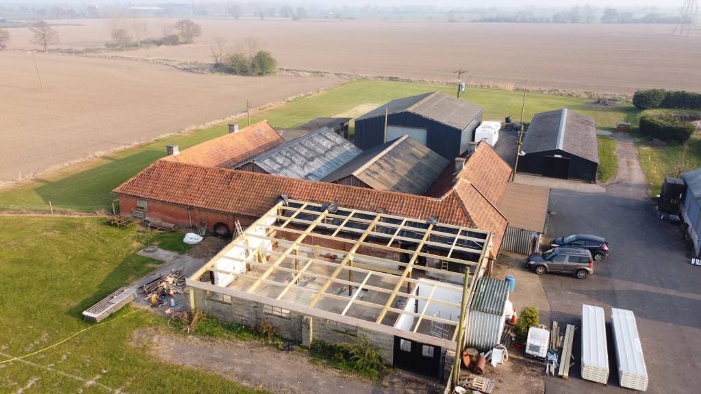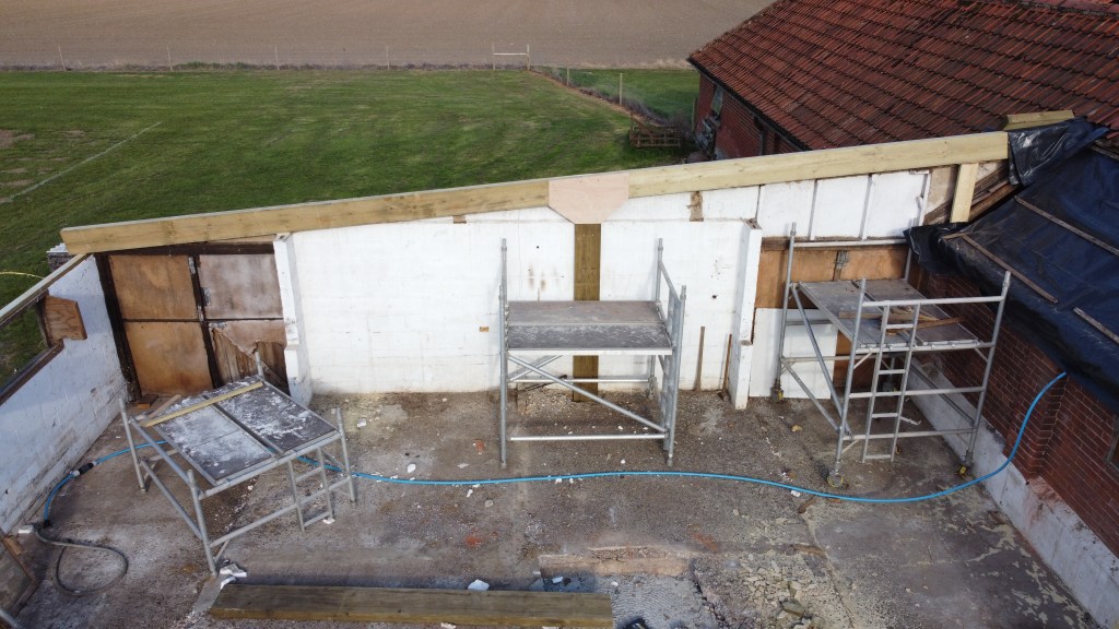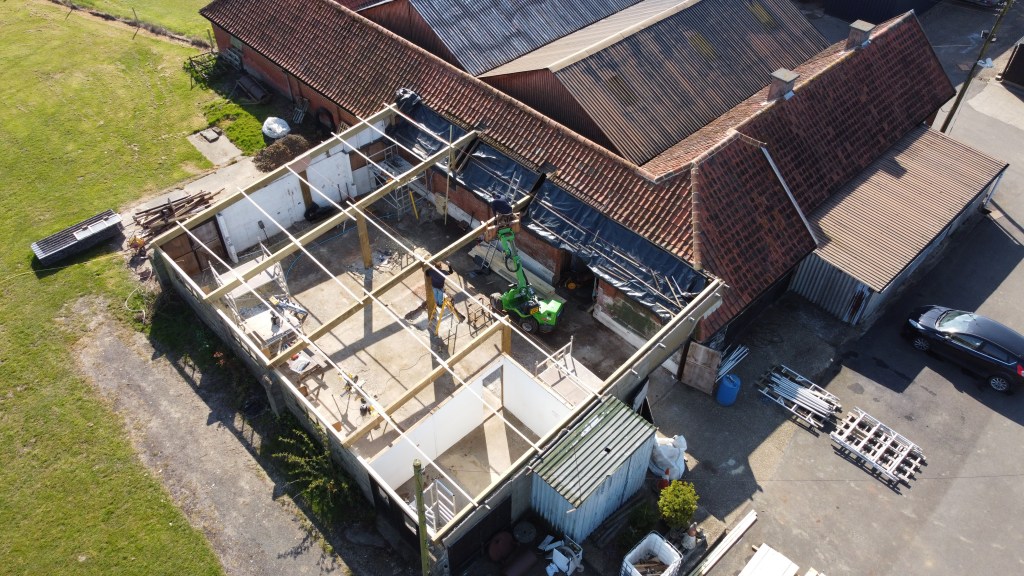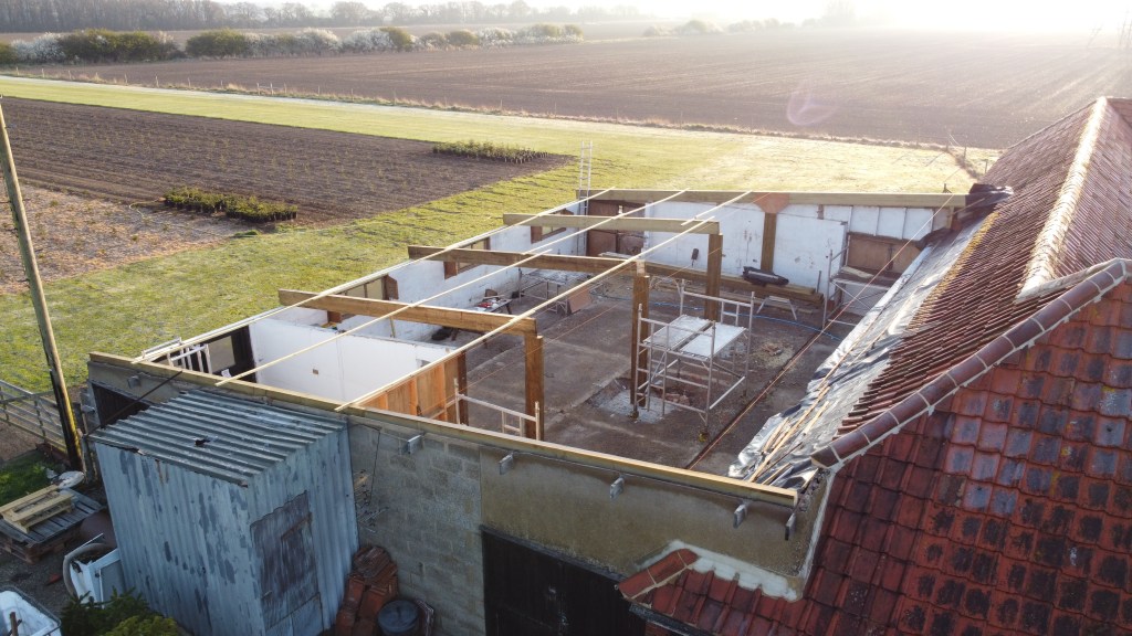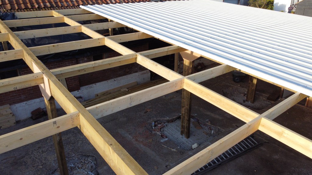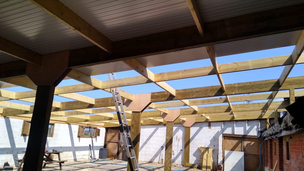 Then we were ready for the framework to be erected! For this local building firm Belmor came and spent a week making a bespoke frame that fitted around the original walls and making sure it stayed within keeping of the original roof. They have done a fantastic job and the wooden beams are a real feature of the shed.