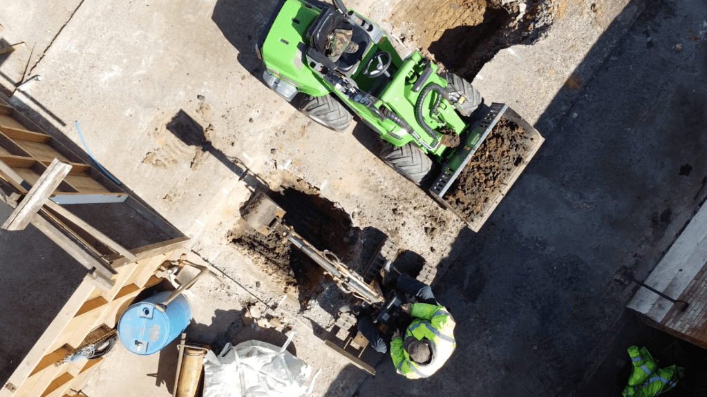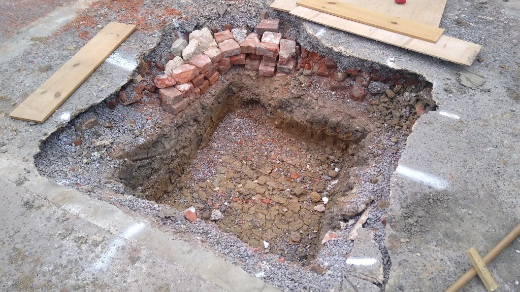 Firstly we started by digging out new footings for the 3 posts that will support the shed. For this we had to break up the the old floor, working out where the new floor level will be (more on this later) and digging a 0.6m cube in readiness for the concrete. We then had a local concrete mixing firm come and mix up the concrete as we ran it to the holes in wheel barrows.